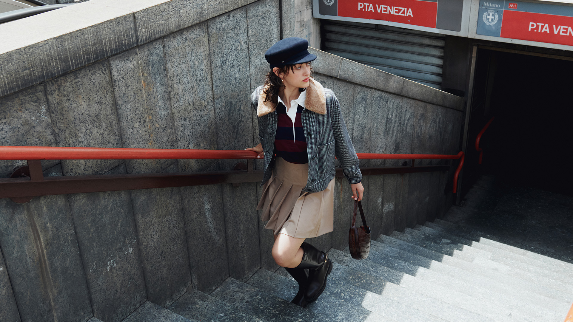 Complete the outfit with a classic navy or micro-check peacoat. Loafers are updated in contrasting black and white: where elegance blends tradition and trend.