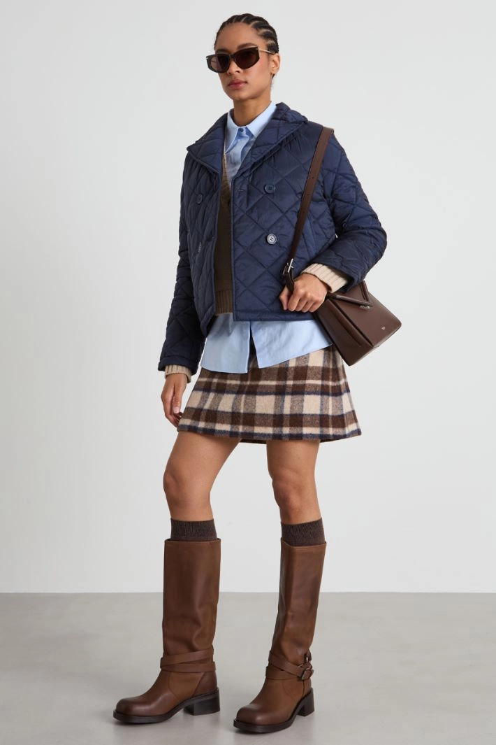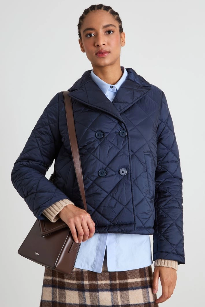 Padded, straight-fit jacket in technical satin, with lapel collar, long sleeves and welt pockets on the sides. Double-breasted fastening with buttons.