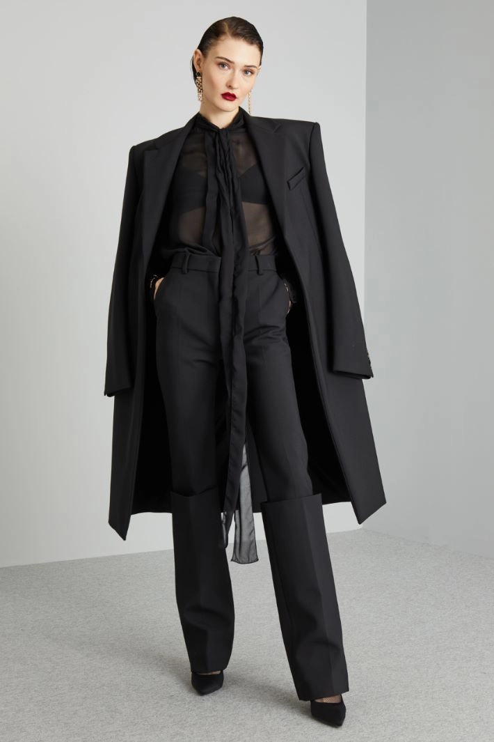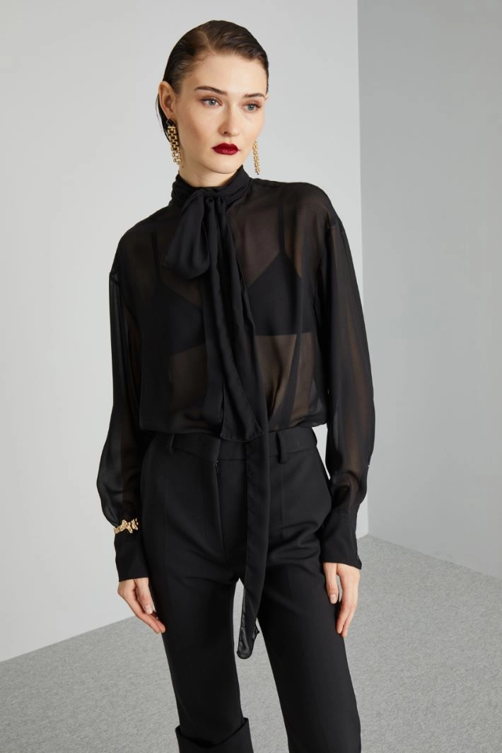 Slip-fit chiffon ​​blouse with scarf collar, long sleeves with cuff and buttons, yoke cut with box pleat on the back and hidden fastening with buttons on the front.