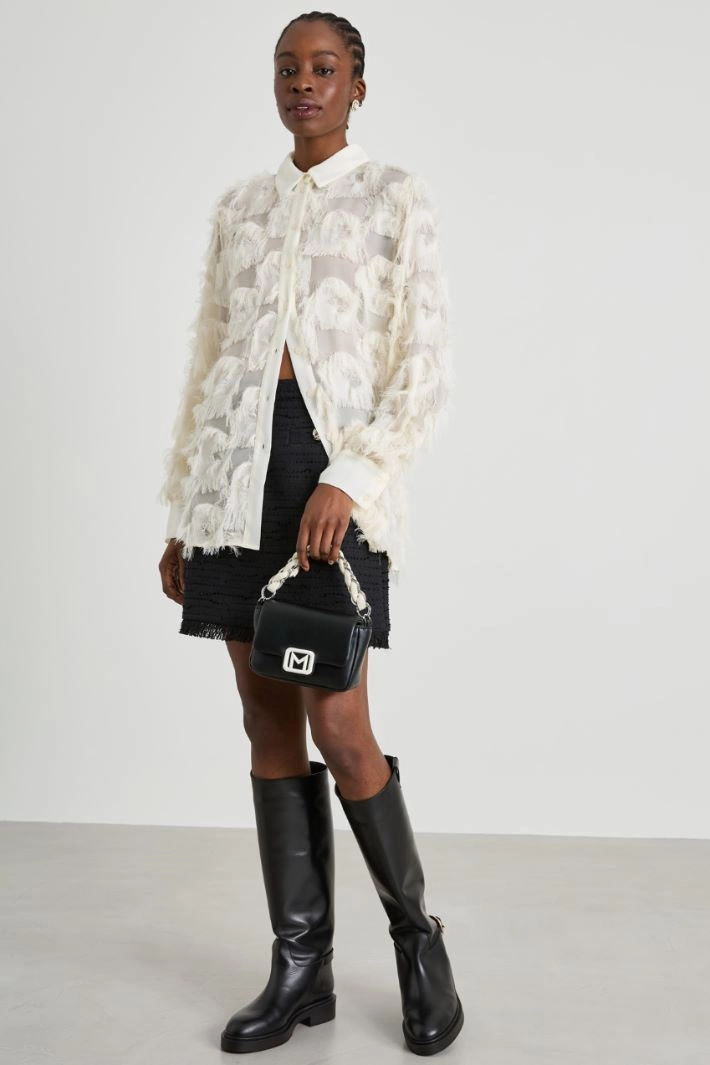 Slightly flared skirt in cotton blend basketweave, with faux welt pockets and button on the front, and invisible zip fastening on the back. Lined.