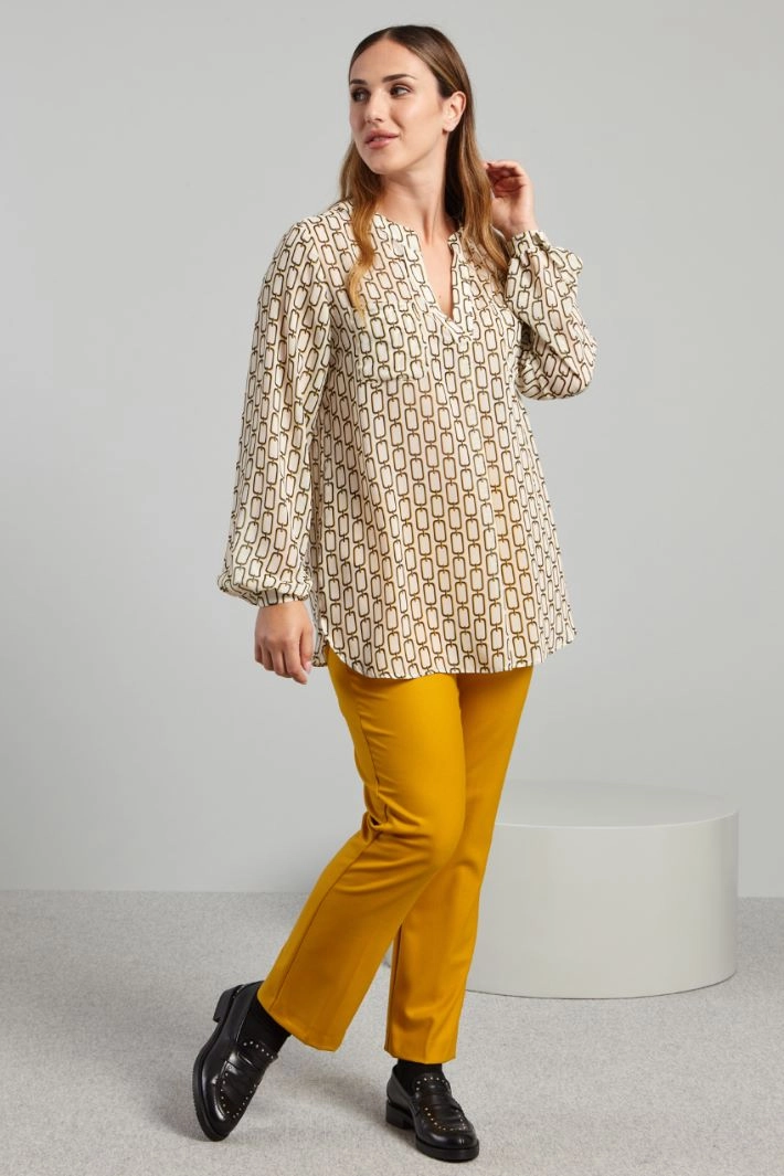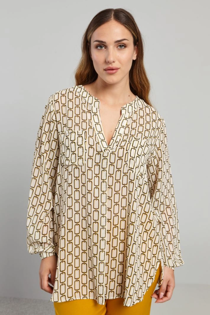 Fluid blouse in printed georgette, with stand-up collar and V-shaped opening on the front, long sleeves with thin cuff and button, patch pocket on the chest, side vents at the bottom. Yoke and pleat on the back. Partially-lined.