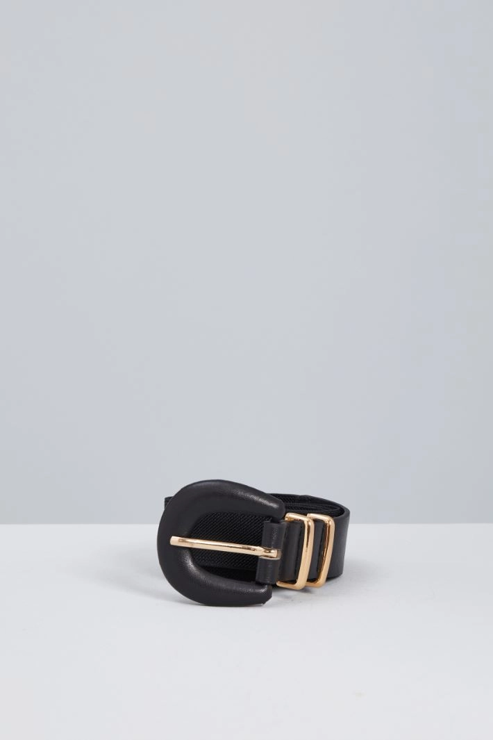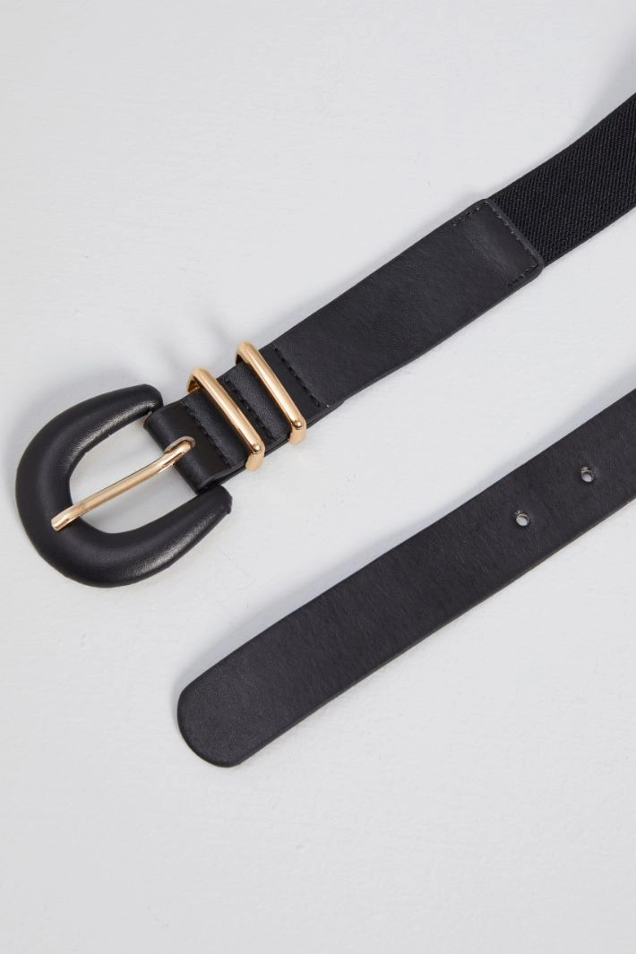 Belt in faux leather and elastic, fastened with a metal buckle and pin.